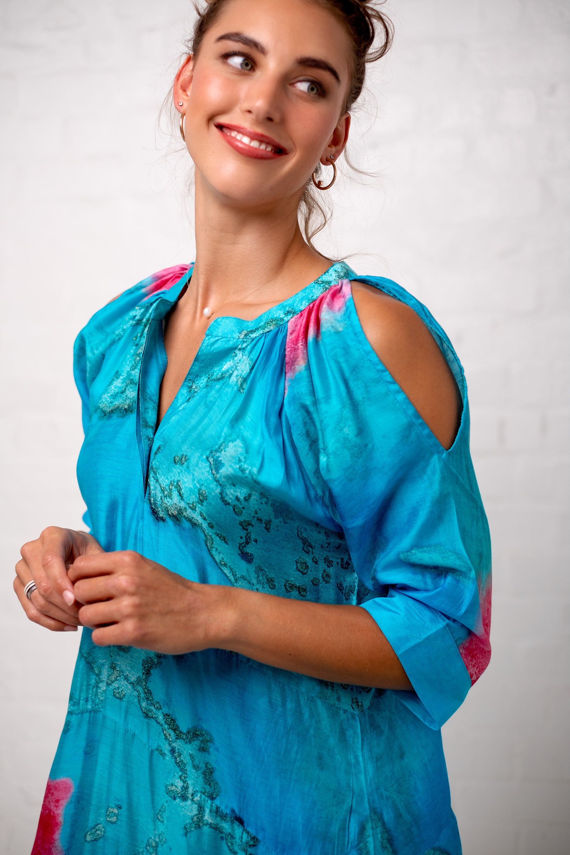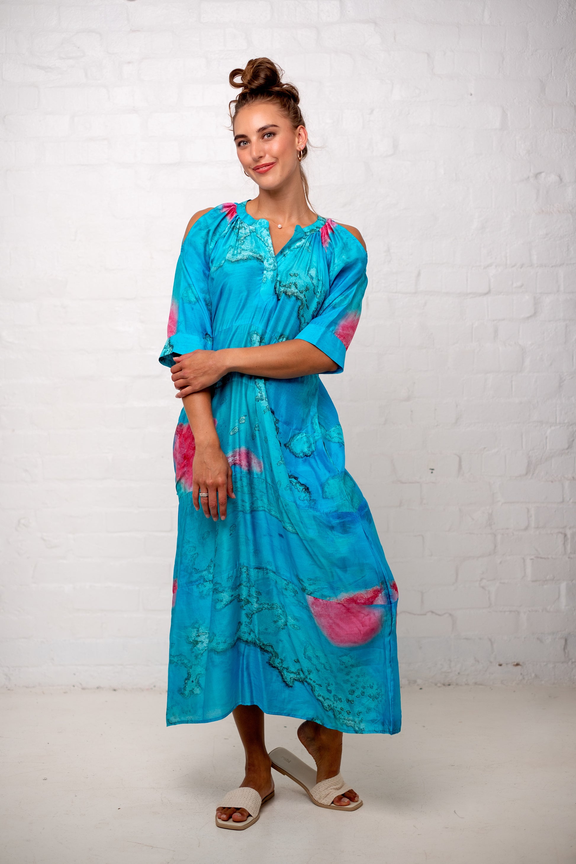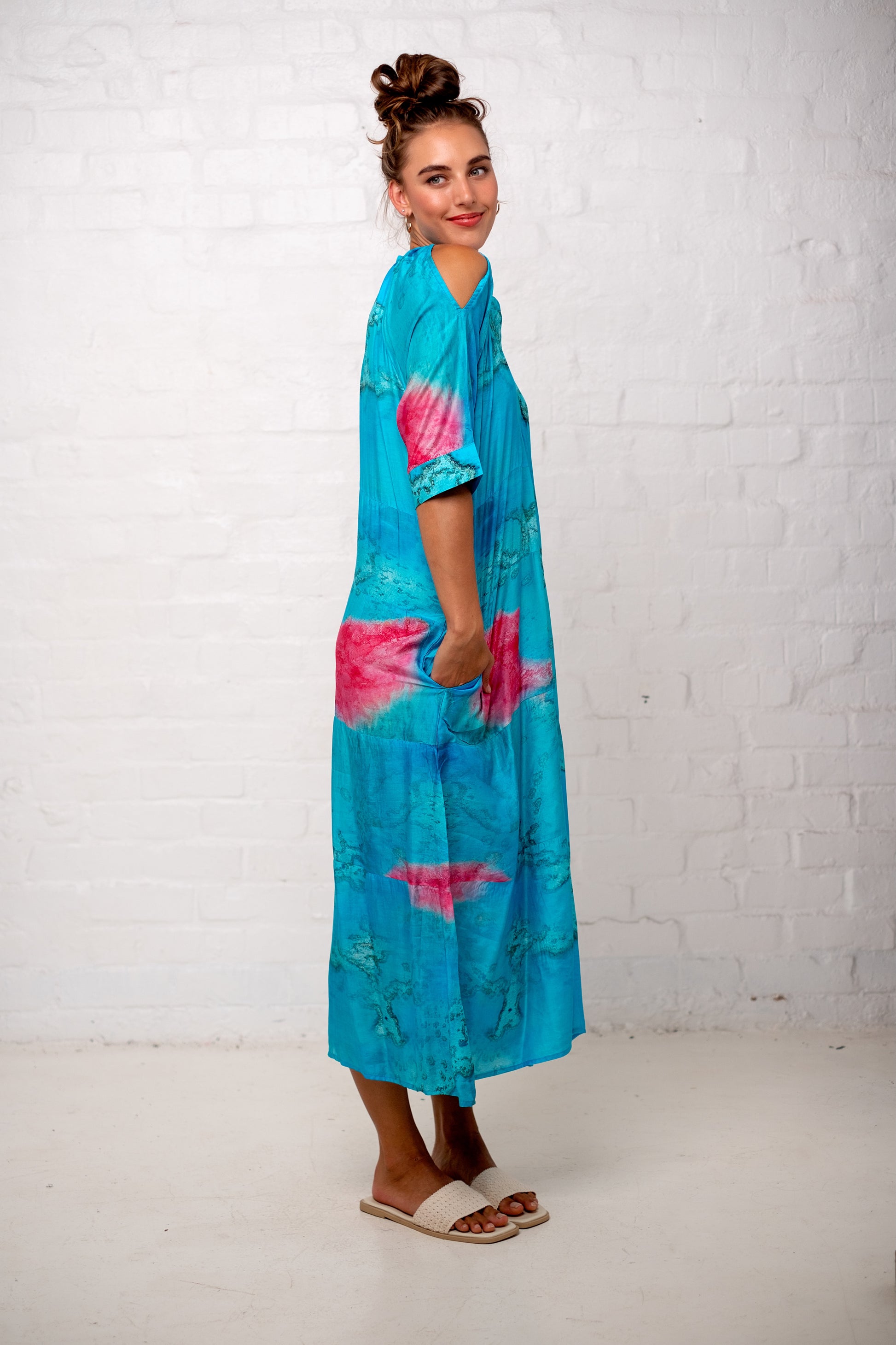 The Adalynn Dress from Iconic in this gorgeous and fresh turquoise tulip design is made from Viscose Crepe and features an easy, flowy silhouette with a flattering midi length.