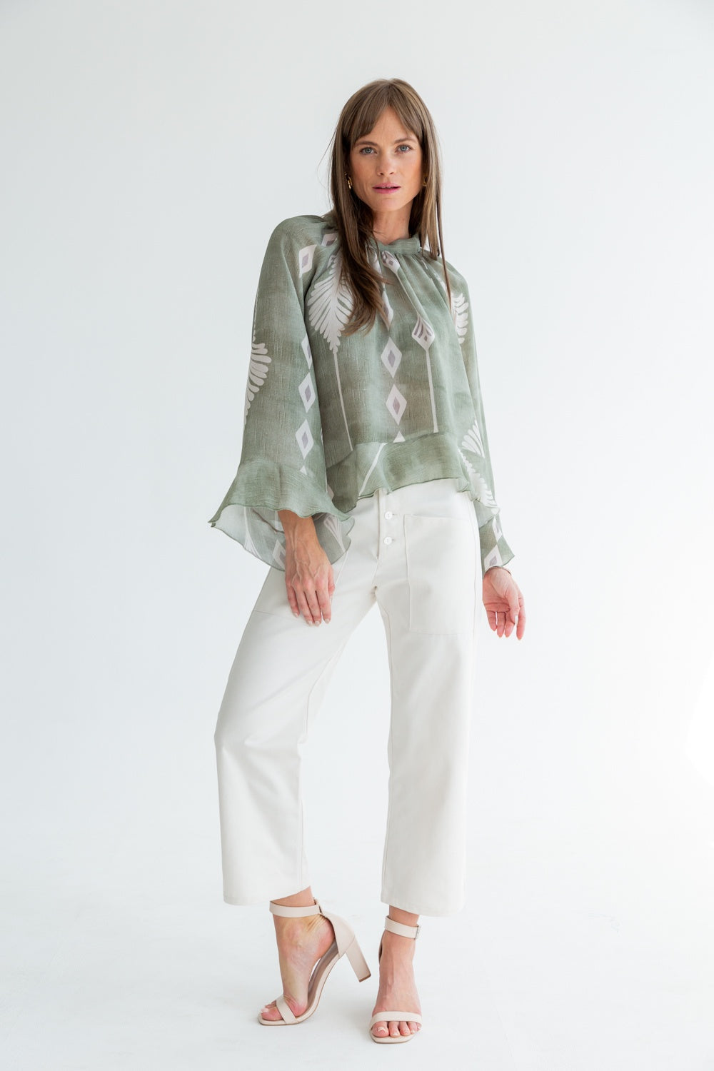 Light and effortlessly elegant, the Arianna Top from Kinda is a beautiful blend of romance and refinement. Made from airy chiffon, it features a delicate tie detail at the back and a beautifully scooped hem for a soft, flowing silhouette. The long sleeves are finished with a subtle frill, adding a touch of romance, while the slightly cropped front creates a flattering shape.