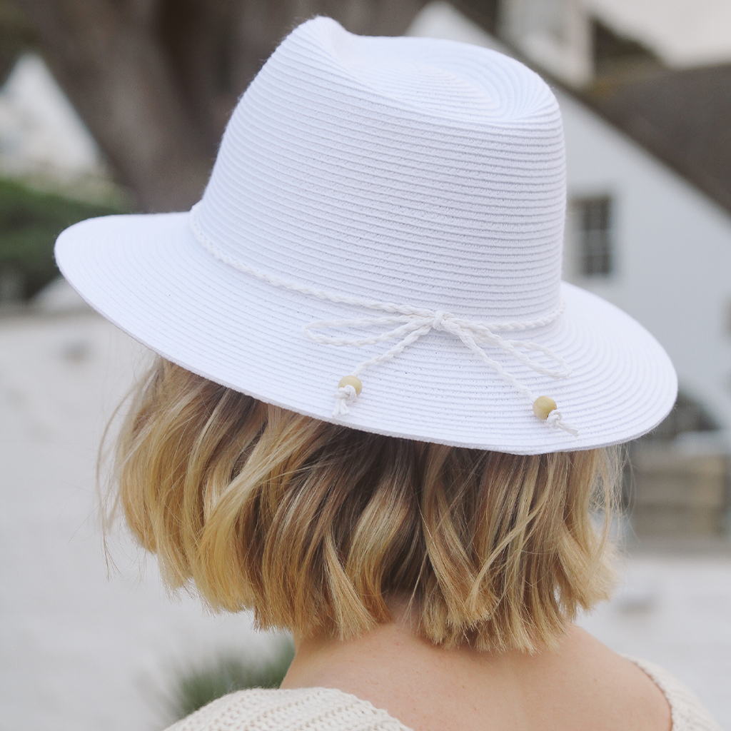 The Avoca Fedora is a feminine sun hat with a shallow crown finished with an elegant twisted Raffia trim, bow at the back and genuine wooden beads. Its Flexibraid material provides maximum comfort.