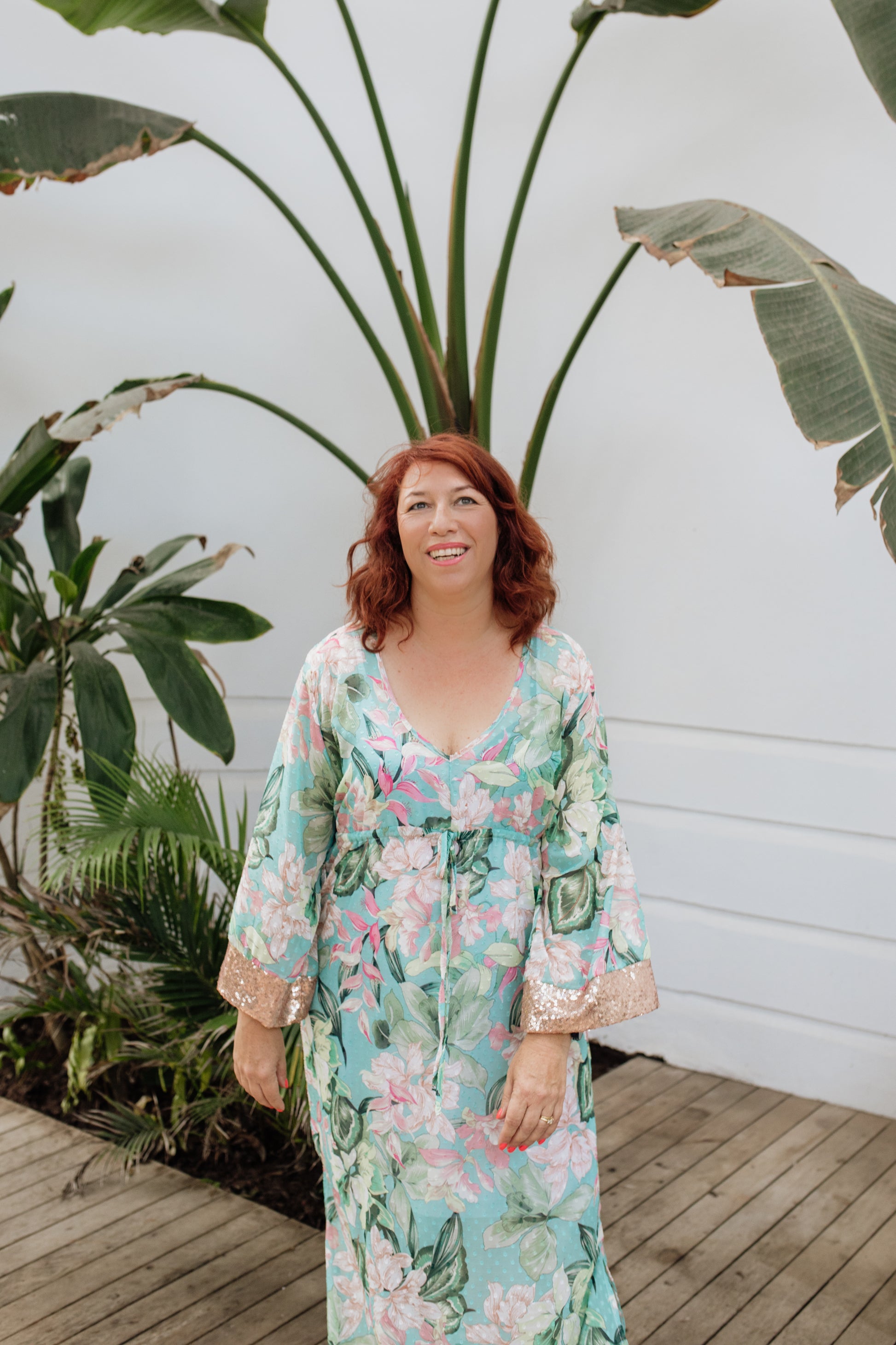 A striking contrast hem with rose gold sequin detailing adds a subtle shimmer, giving the dress an elegant finish without being fully sequined. Lightweight and easy to wear, it’s perfect for relaxed days, holidays, or evenings when you want comfort with a hint of sparkle.