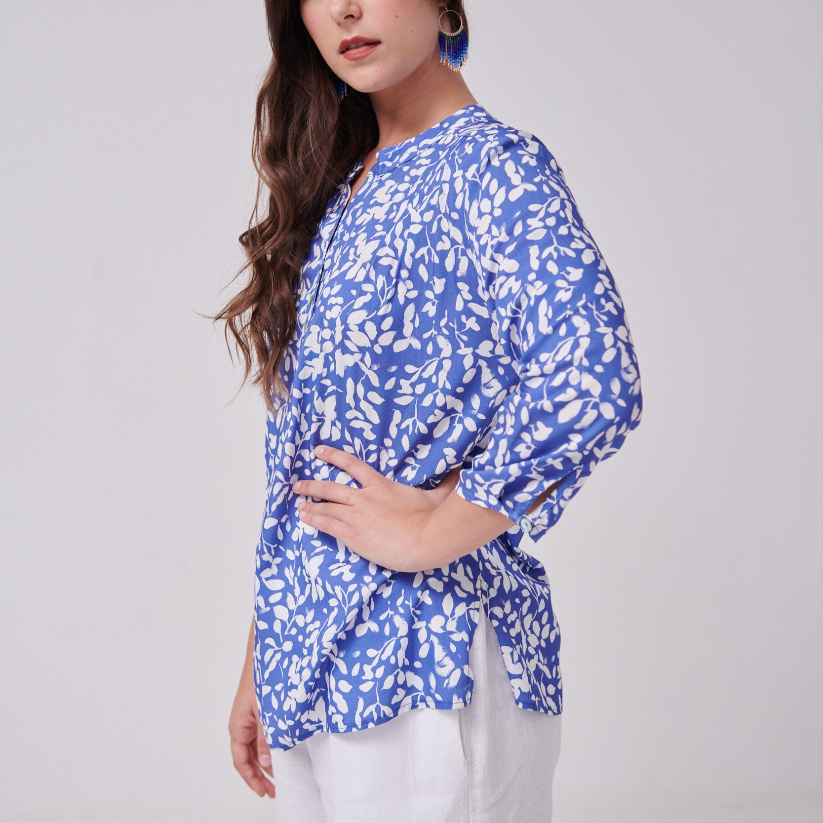 Featuring a mandarin neckline with a button placket, delicate front pleat detailing, and ¾ sleeves, this blouse pairs effortlessly with both casual and tailored pieces. Thoughtful side slits add ease of movement, making it as flattering as it is wearable.