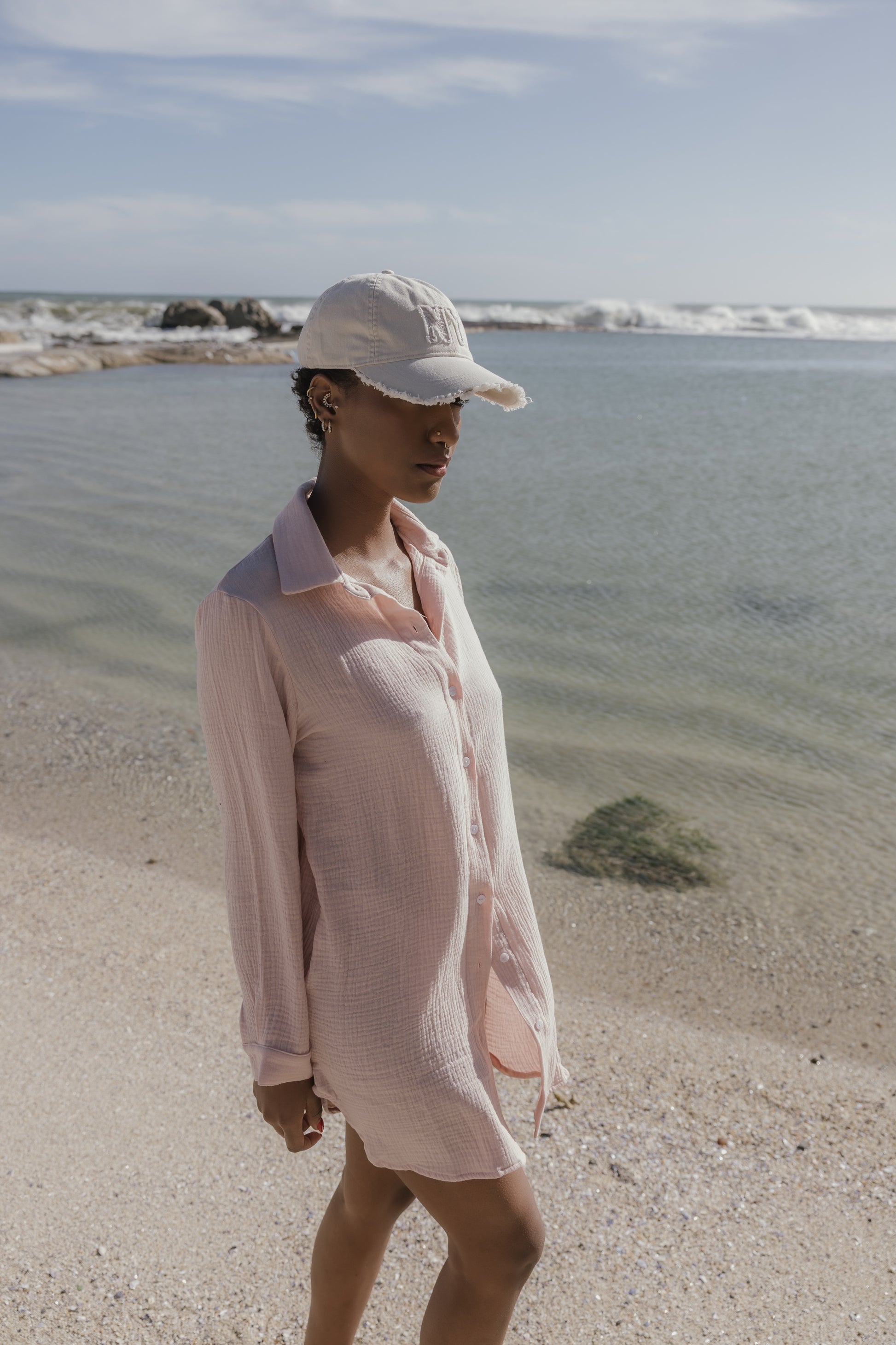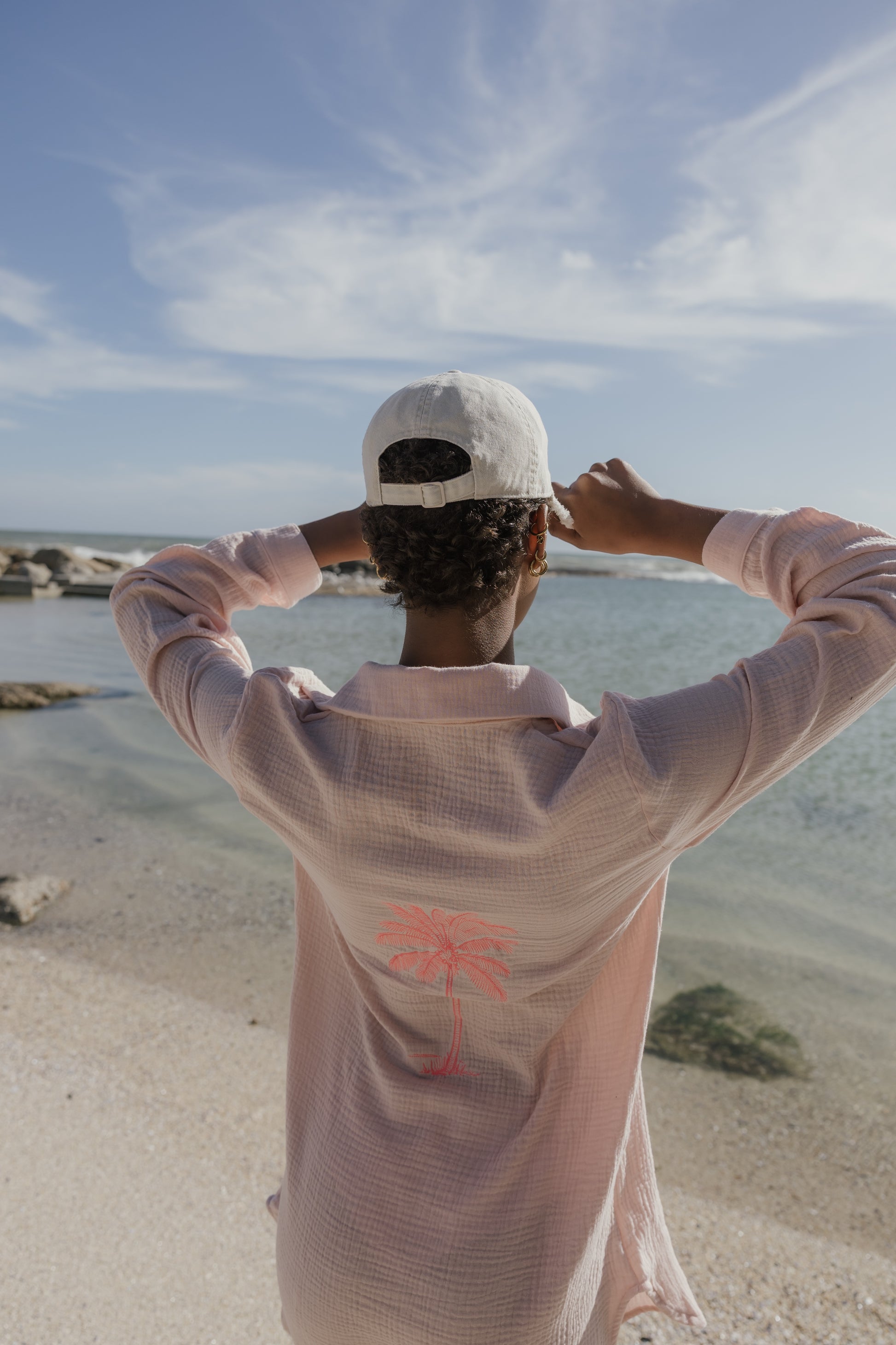 The Long Beach Shirt Pink Palm from Lila Rose is the ultimate blend of laid-back comfort and effortless style. Crafted from soft double muslin cotton, it offers a light, airy feel with a naturally textured finish - perfect for warm, breezy days. This relaxed long shirt features a button-up front, long sleeves with cuffs, and a classic collar, making it easy to wear open over swimwear or styled as a casual cover-up.