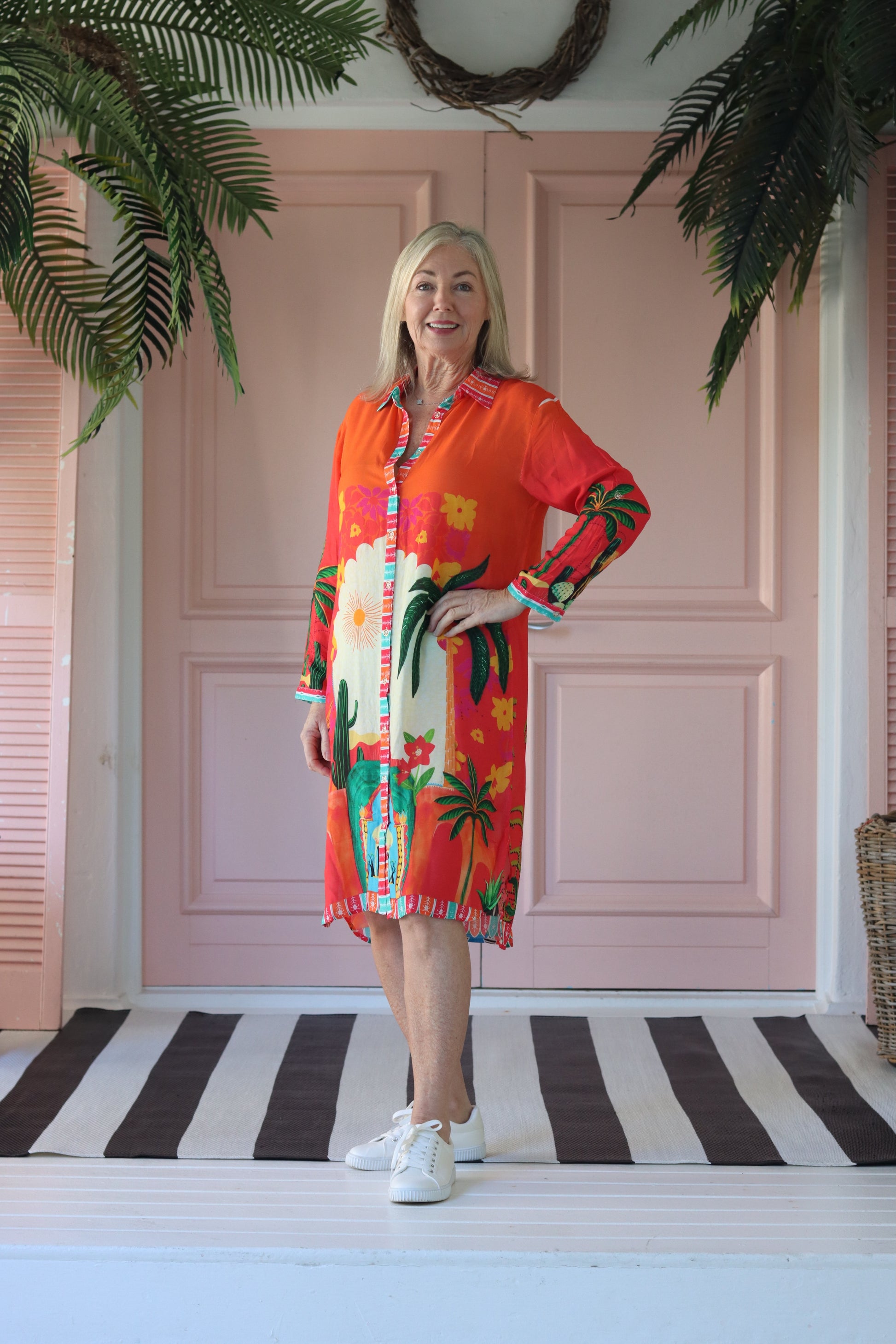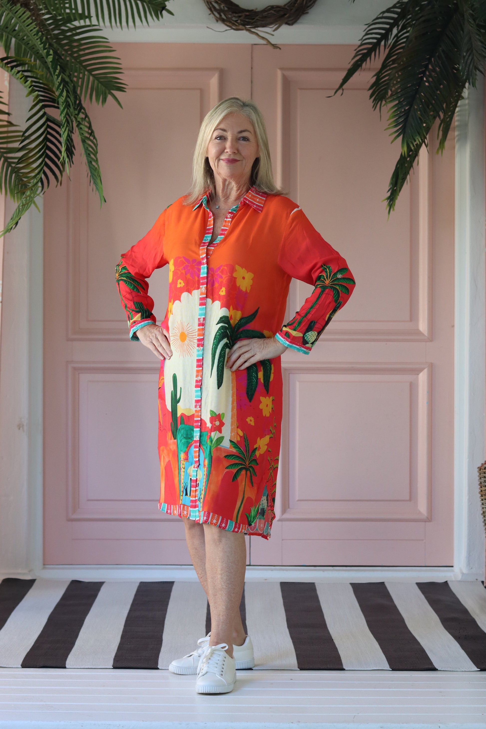 Add a pop of sunshine to your wardrobe with the Maddison Short Dress Sunset Fiesta by Frock 'n Roll - a vibrant blend of playful charm and effortless comfort. Featuring relaxed tab sleeves, a generous fit, and radiant sunset-inspired tones, this short-length dress is designed to light up any occasion. A flattering traditional collar with front button stand completes the look with a refined finish.