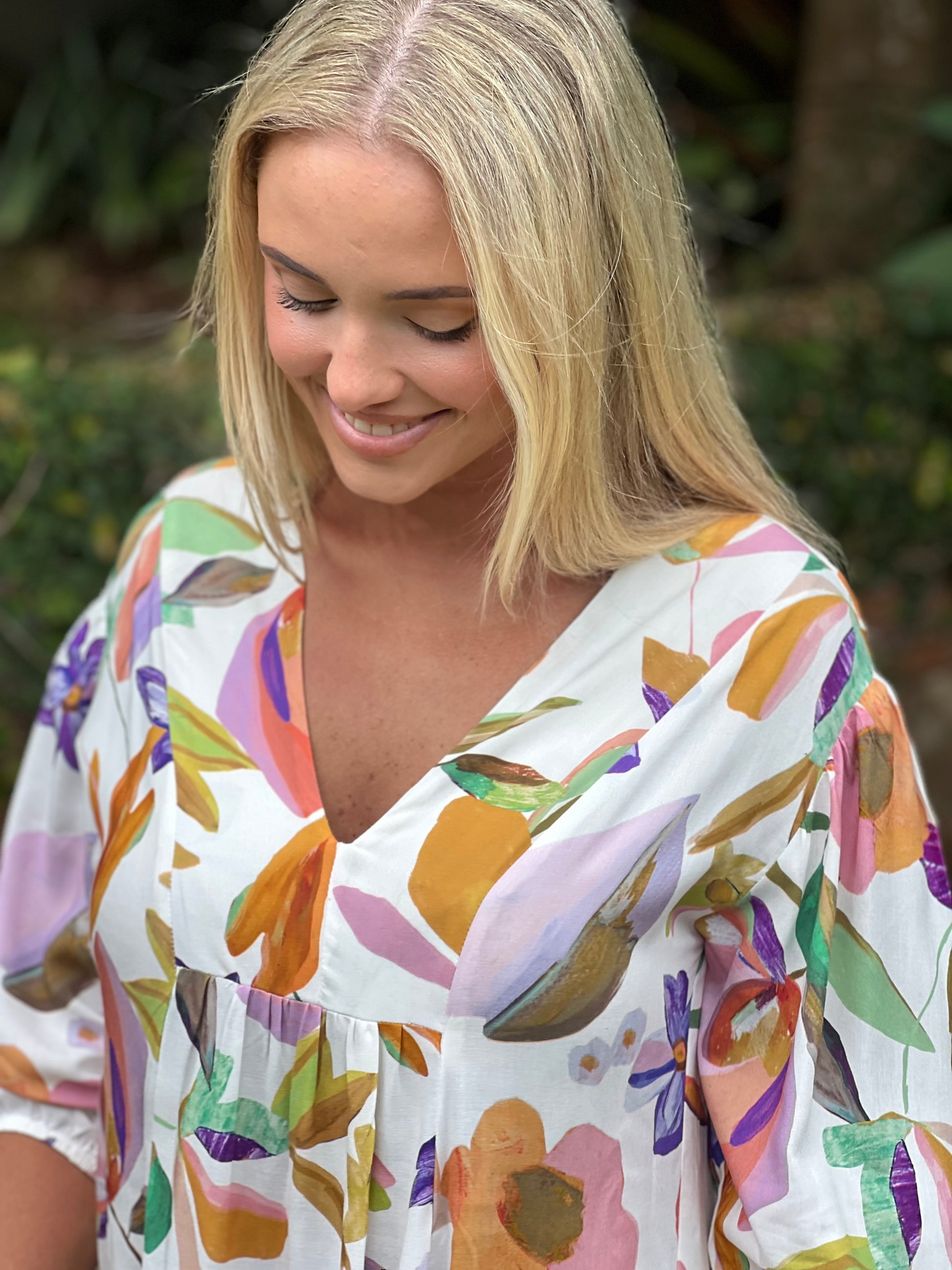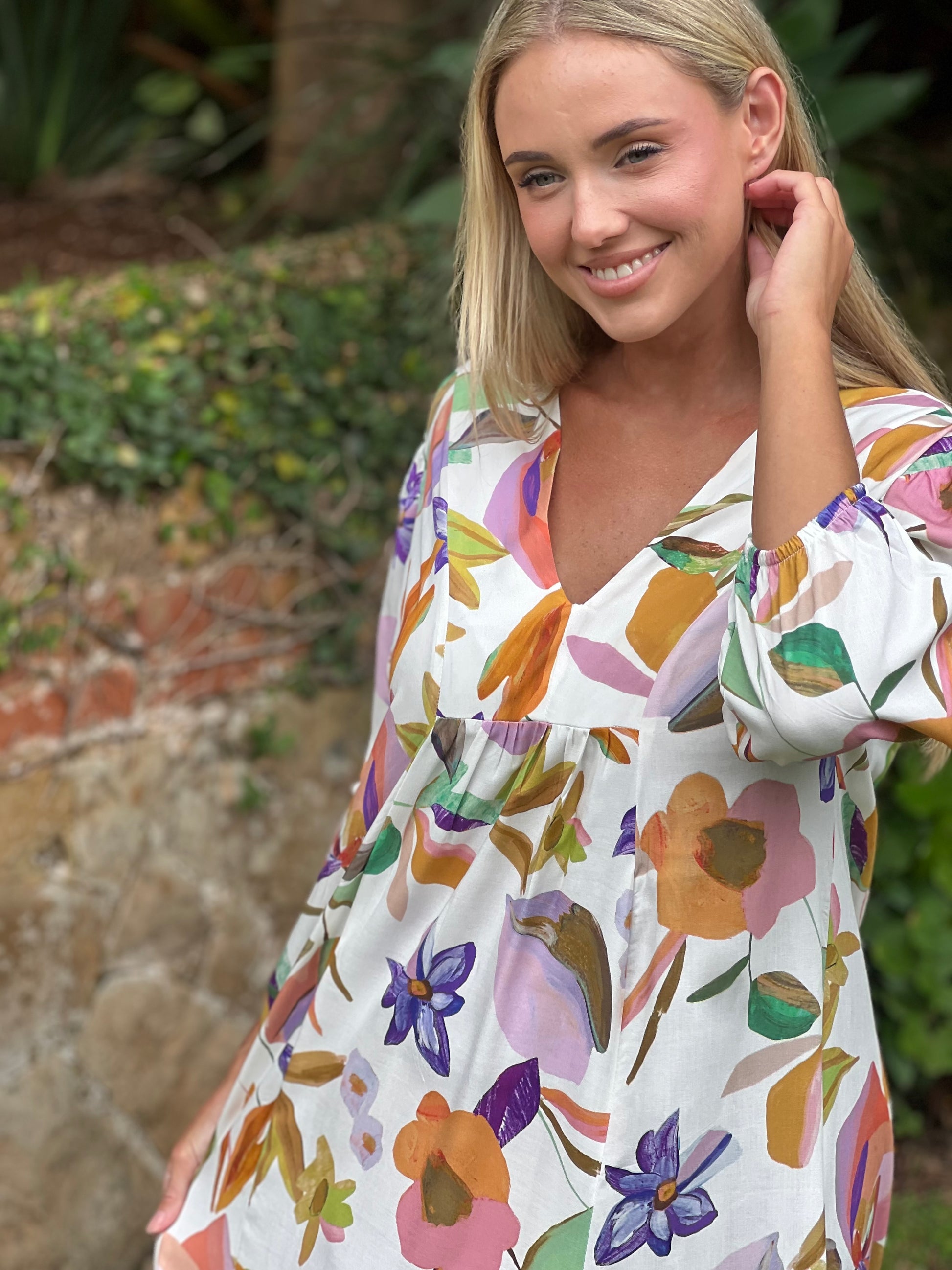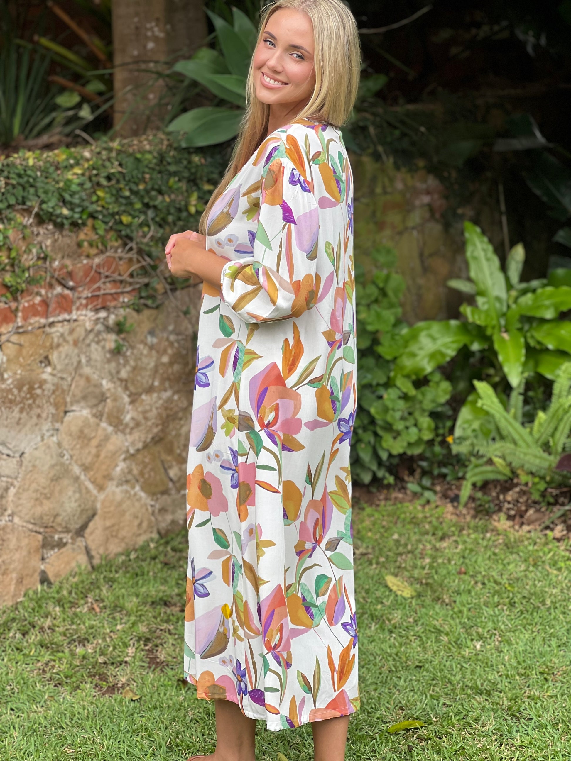 Bright, breezy, and effortlessly elegant, the Marina Dress White Floral Viscose by Full Cream is your go to piece for easy summer style. Featuring a soft white base with a delicate floral print, this flowing maxi dress brings a fresh, feminine feel to your wardrobe.