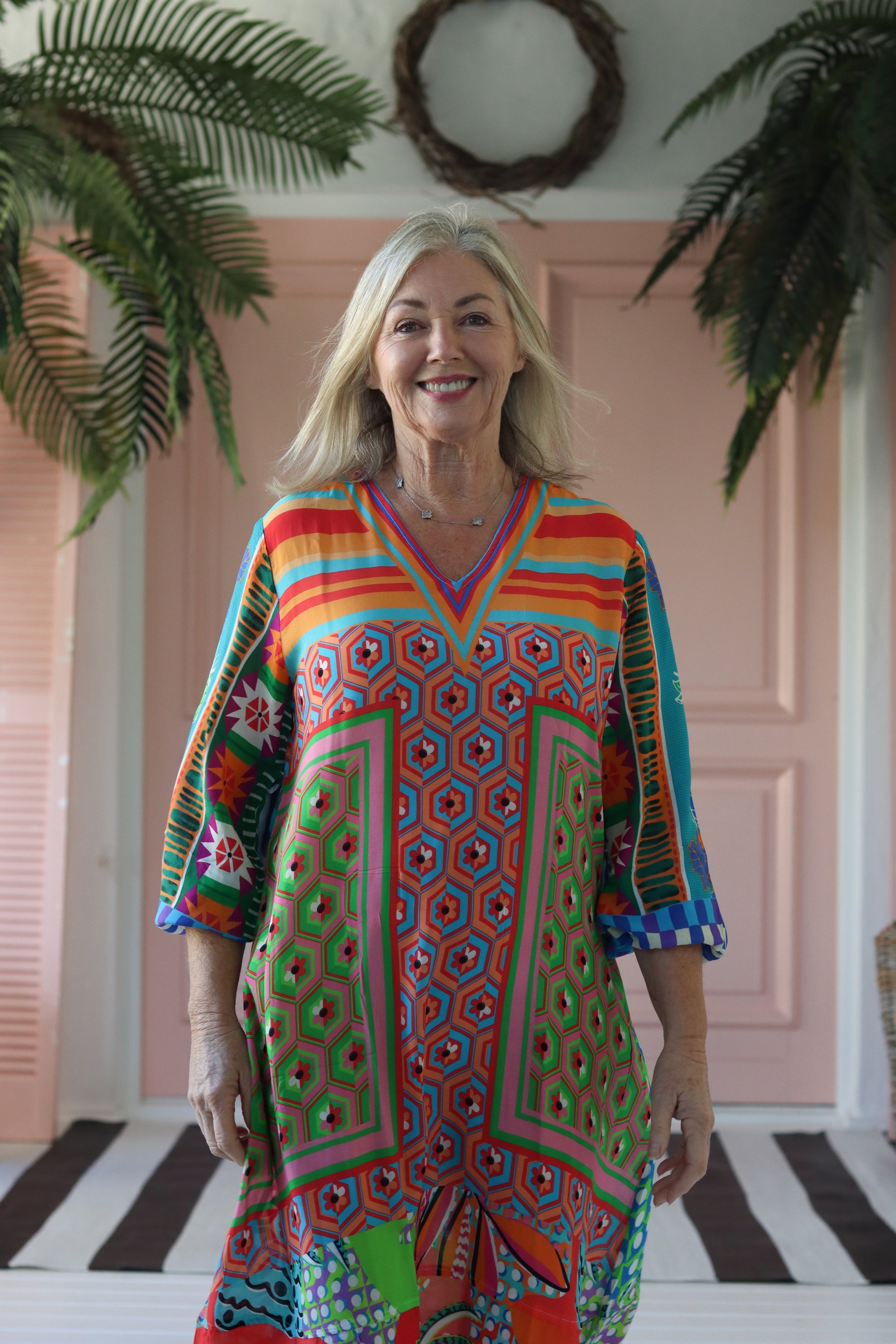 Step into the Plett Kaftan Patchwork Tropical and embrace carefree elegance with a burst of colour.