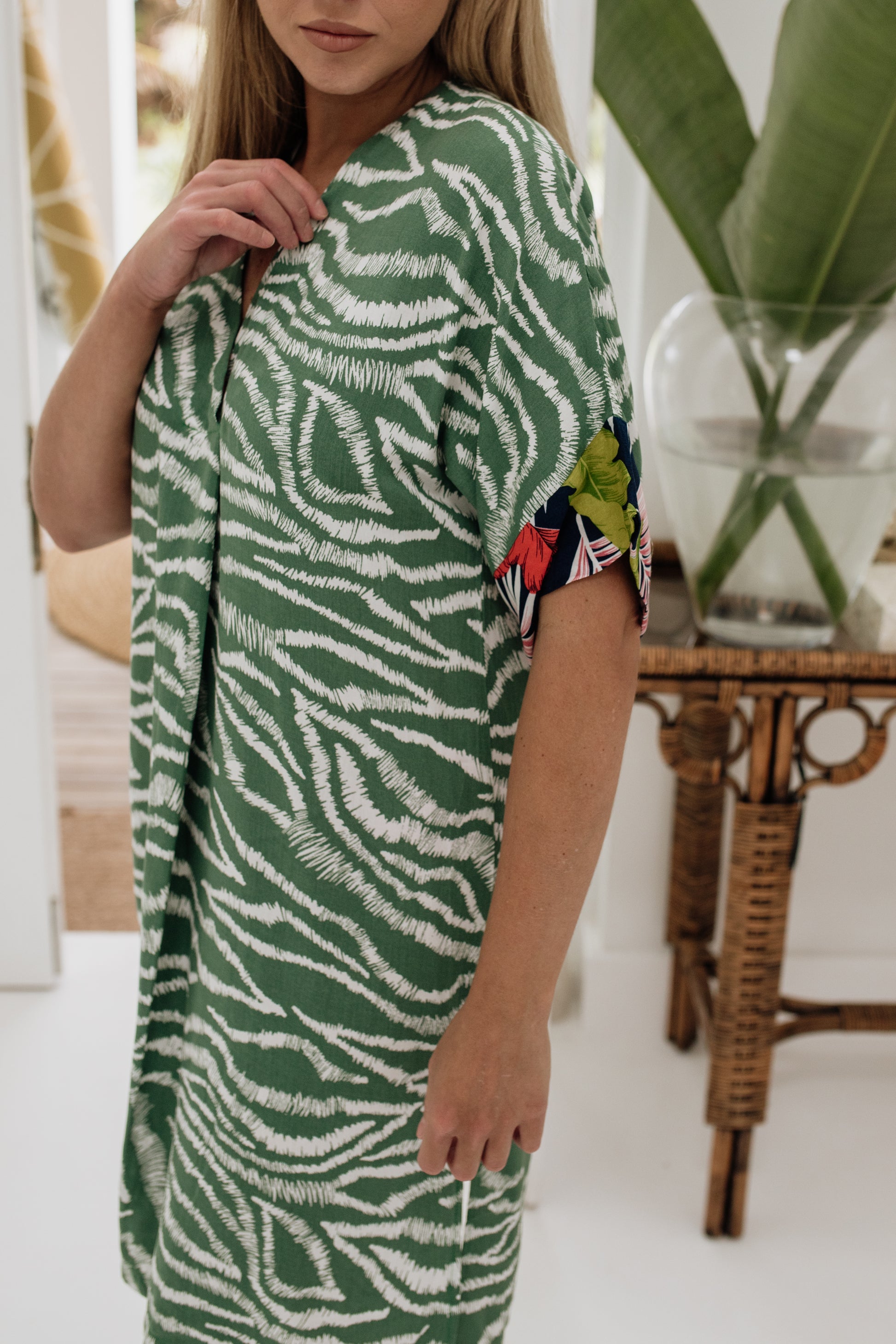 Comfortable, confident, and beautifully detailed, the Short Larissa Dress Green Zebra is a dress that does it all.