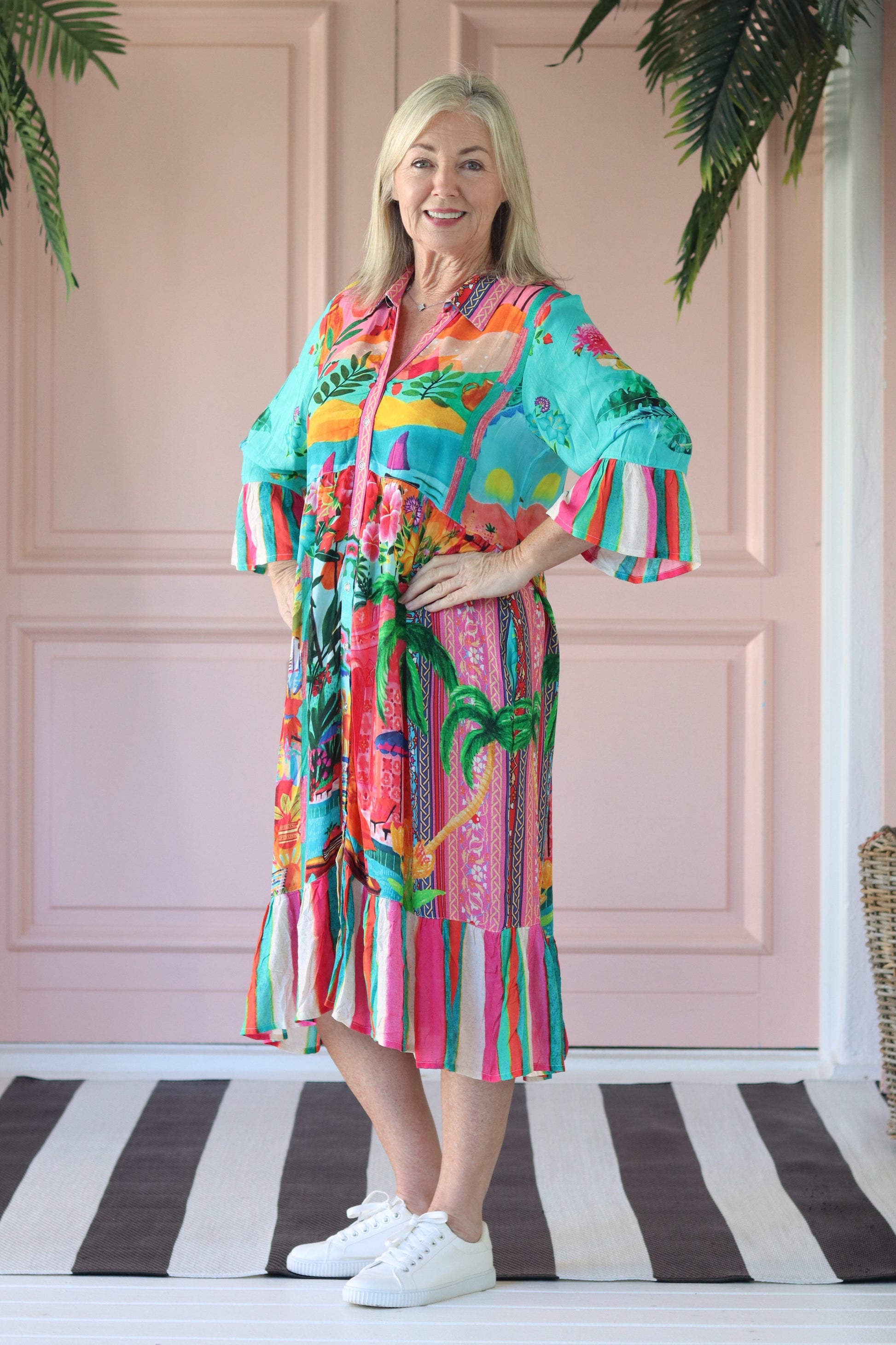 Bring playful charm to your wardrobe with the Suzi Boho Dress Holiday by Frock 'n Roll - a flirty and fun dress designed to turn heads. Featuring a vibrant, striking print and classic bohemian styling, this 3/4 length dress combines effortless comfort with standout style. Frill sleeve details add a touch of femininity, while the traditional collar with V-neck and front button stand gives the dress a polished finish.