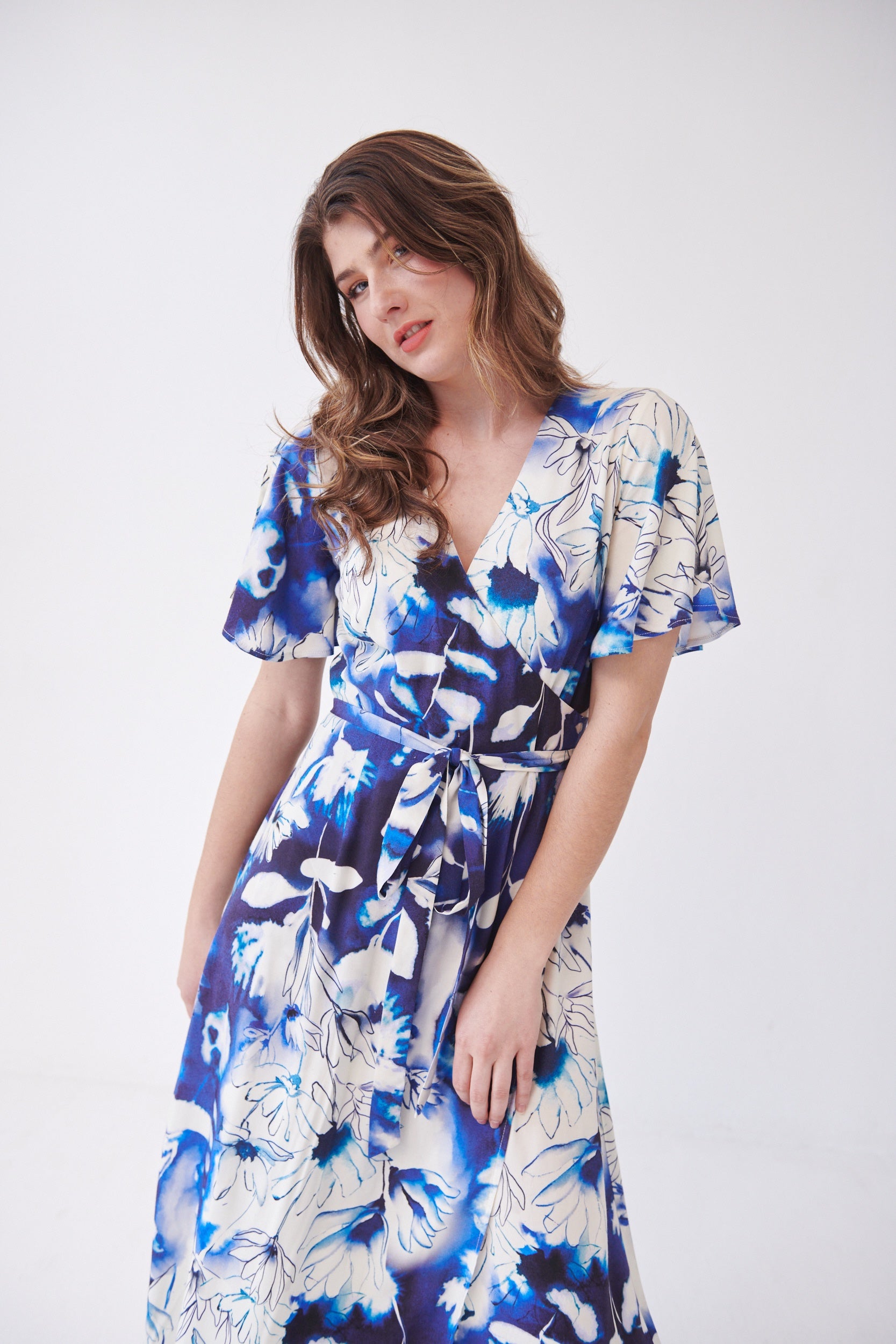 Elevate your wardrobe with the stunning Tuscany Wrap Dress Blue Daisies by Willow—a timeless blend of elegance and comfort. Featuring flutter sleeves with a delicate slit detail, this maxi-length dress is designed to flatter every silhouette. The adjustable belt tie accentuates the waist, creating a graceful and feminine shape.
